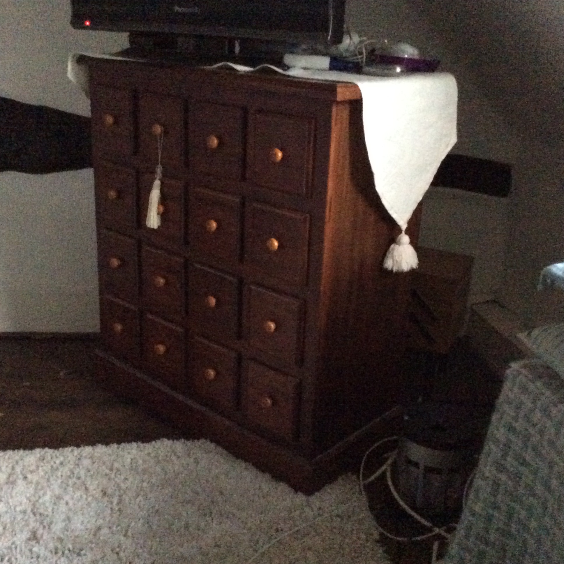 Still working on the clutter.    Today I turn my attention the  wonderful piece of furniture that takes pride of place in our main bedroom.    It is an apothecary’s chest that was made by my Uncle Den.   Den was a master carpenter, who over many years came to stay with us at Christmas, and each year presented us with a miniature apprentice piece of furniture that he had made specially for us.    It was always a joy to receive these unique and lovingly crafted gifts and they now adorn almost every room in the house.